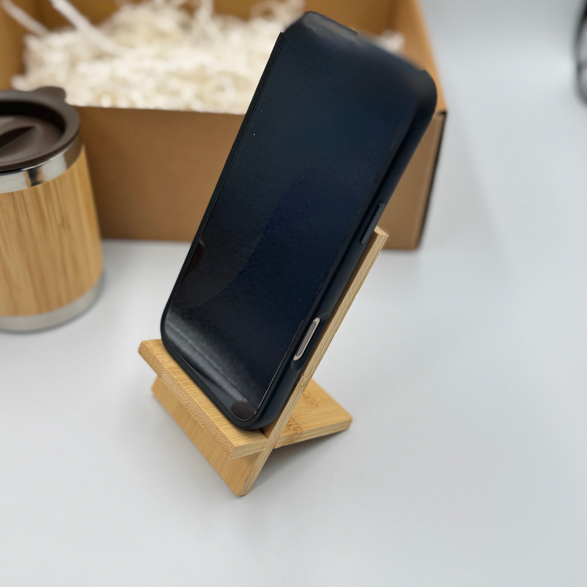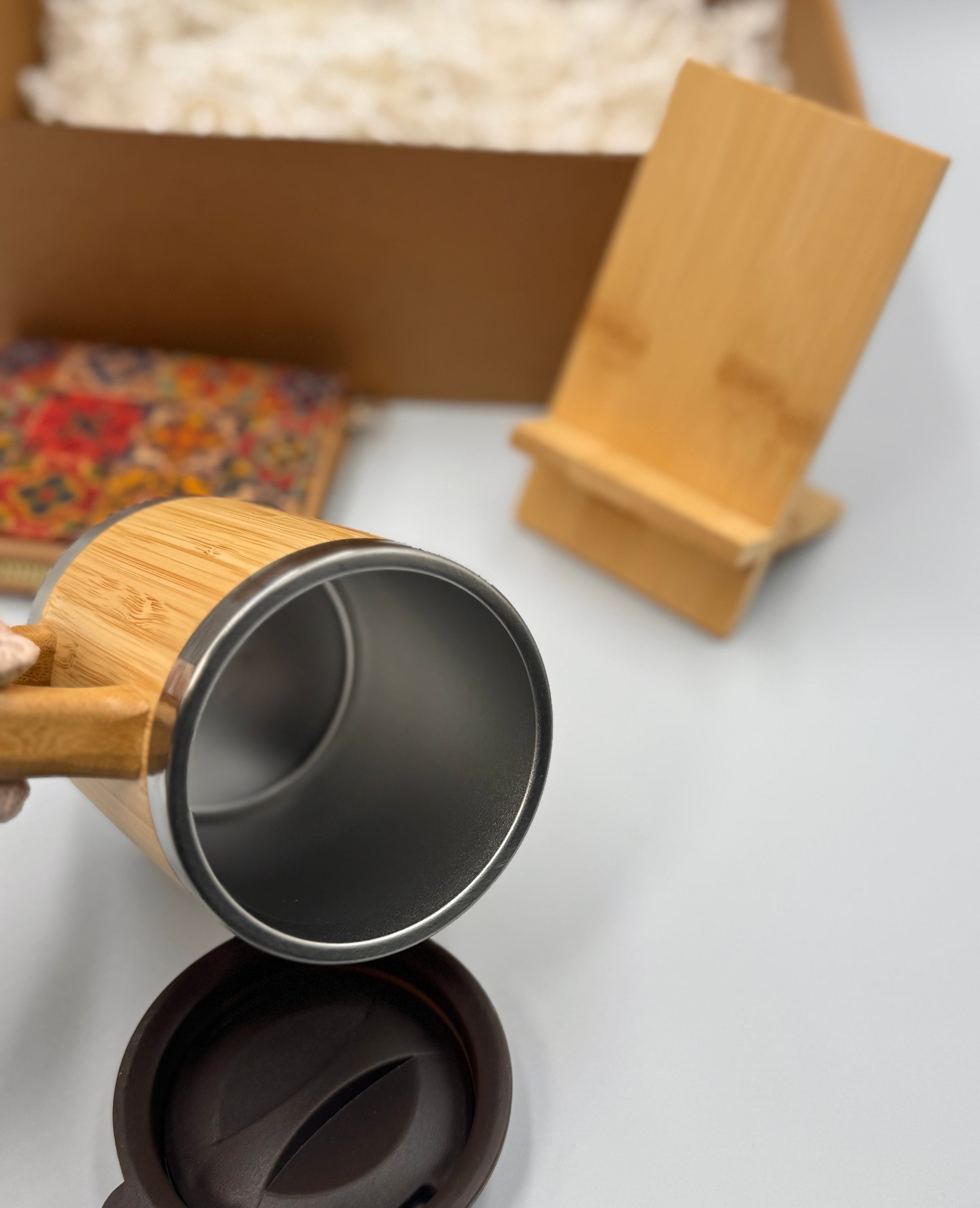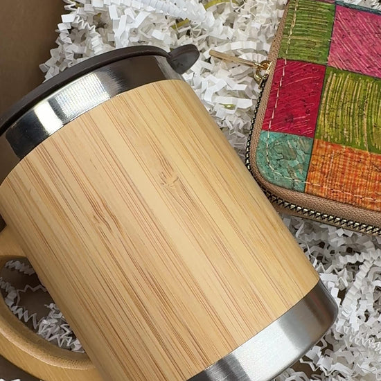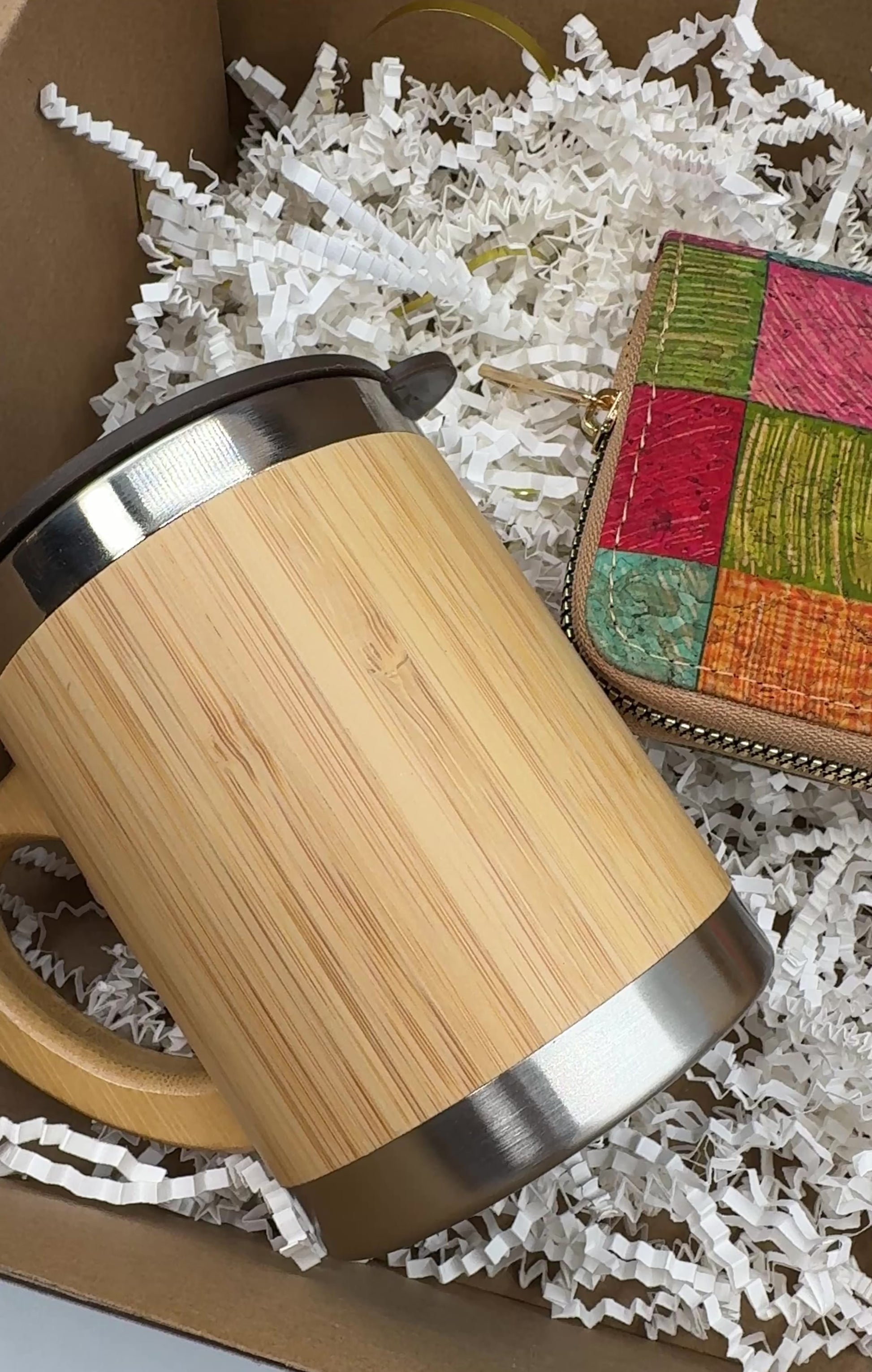 Each kit includes a bamboo insulated tumbler, bamboo phone stand, and a cork wallet, all thoughtfully packed in 100% recyclable packaging.